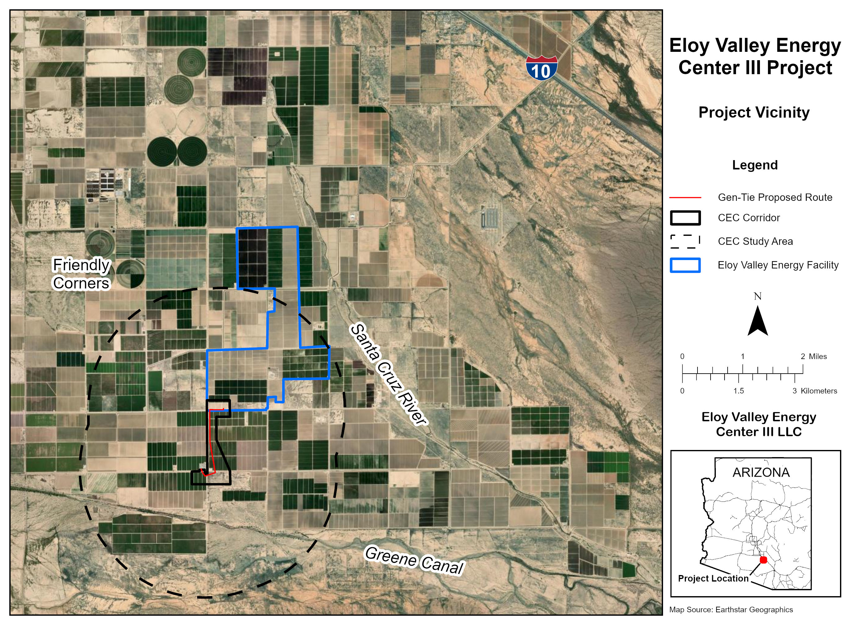 A Certificate of Environmental Compatibility (CEC) from the Arizona Corporation Commission (ACC) and the Arizona Power Plant and Transmission Line Siting Committee (Line Siting Committee) is required to construct the Eloy Valley Energy Center III Project (Project). Eloy Valley Energy Center III, LLC, filed its CEC application with the ACC on December 5, 2025. The CEC application will include environmental studies evaluating the proposed Project. The Line Siting Committee will hold a hearing on the Project on Jan. 20 - 23, 2026. View Map. The Document Number for the CEC application is Docket No. L-21375A-25-0252-00256.