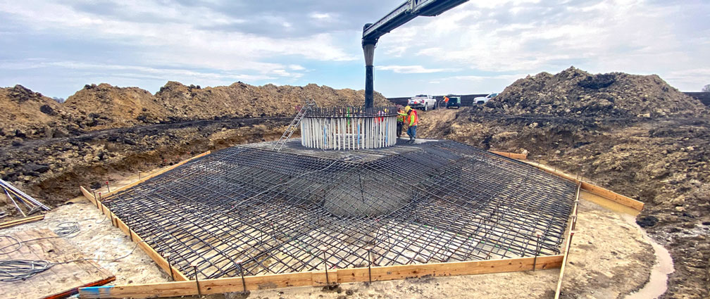 Road work on the project began in February. Crews are currently working to assemble foundations and wind turbine components. Turbine foundations will be made of poured concrete and reinforced with steel rebar to provide strength. Each turbine site requires excavating approximately 302 cubic yards of dirt, adding 25,000 pounds of steel and 188 yards of concrete to build a foundation. Foundations are approximately 10 feet deep and 56 feet wide. Once the foundation is complete, turbines will be anchored by large bolts set in the concrete foundation.